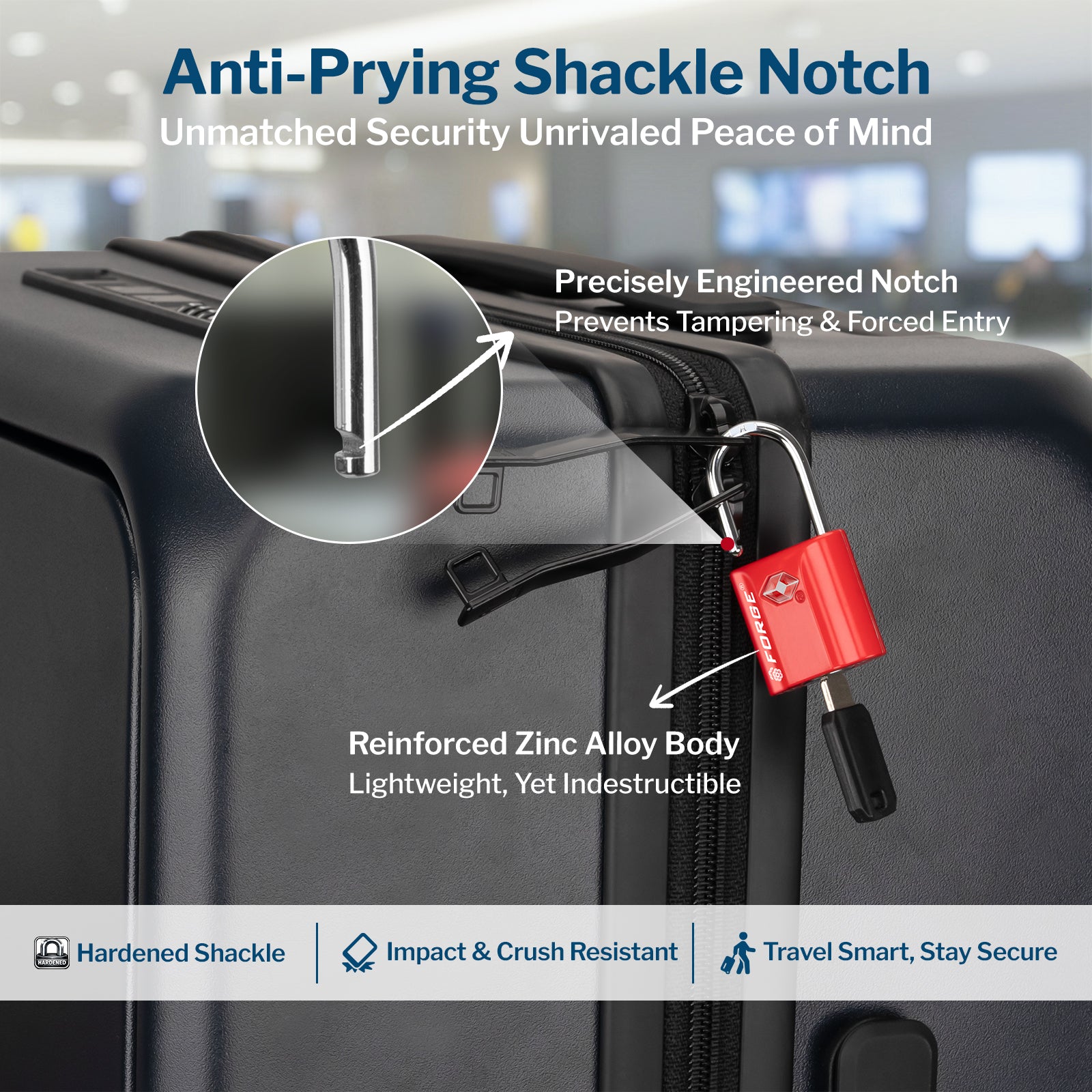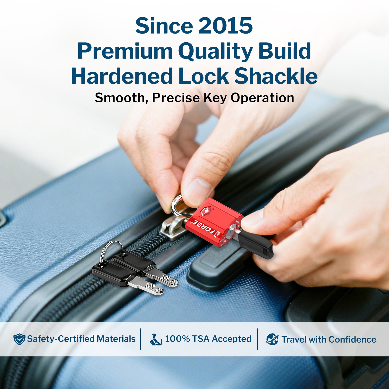 LA CERRADURA MÁS DURADERA RECONOCIDA Y ACEPTADA POR LA TSA. Las cerraduras Forge están diseñadas desde cero para ser las cerraduras de equipaje más resistentes que existen. Nuestros cuerpos de cerradura de aleación especial, grilletes de acero endurecido y mecanismos internos patentados pueden soportar tal impacto que respaldamos nuestro producto con una garantía incondicional de por vida. Si puede encontrar una manera de romper estas cerraduras, con gusto se las reembolsaremos o reemplazaremos.